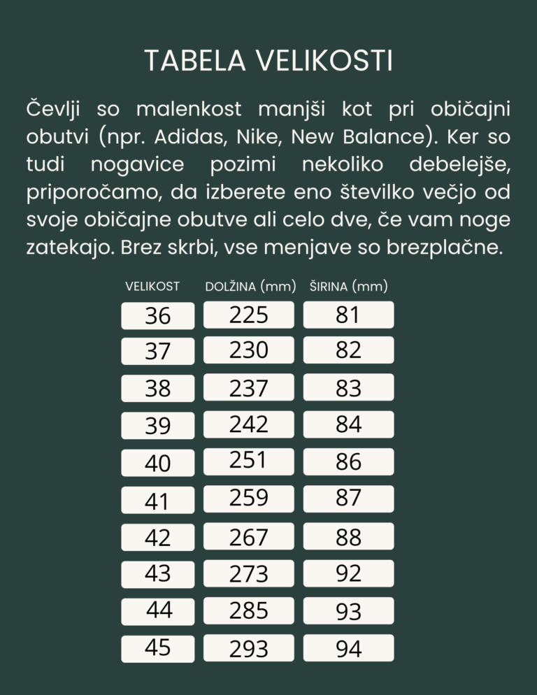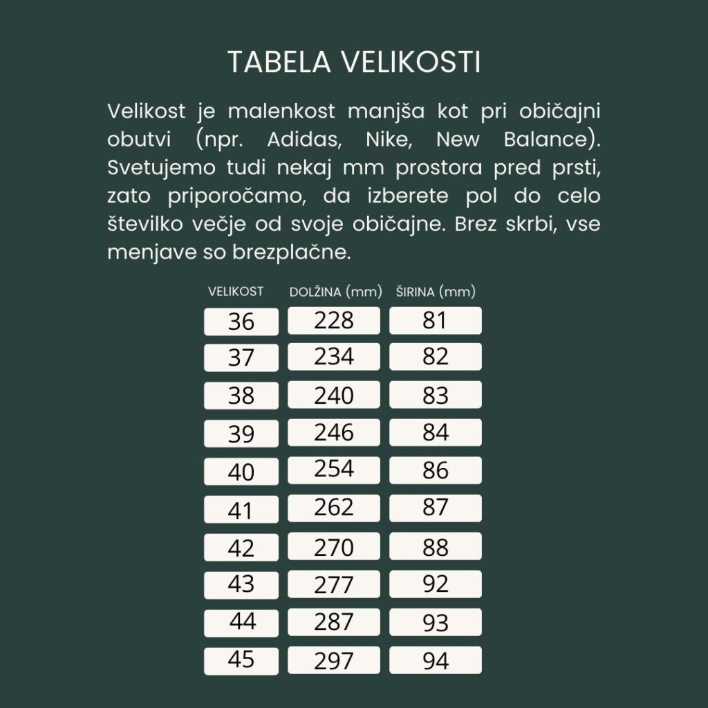 Spodaj si lahko ogledate tabelo velikosti in ocenite katera številka je prava za vas. V kolikor niste prepričani kako dolga in široka je vaša noga jo lahko izmerite. To naredite tako, da stopite na list papirja in postavite peto k steni ter na koncu prstov naredite črto. Temu dodate še približno 5mm in tako dobite pravo številko zase. Bosonoga obutev mora biti udobna zato v dvomu vedno svetujemo raje večjo kot manjšo številko.