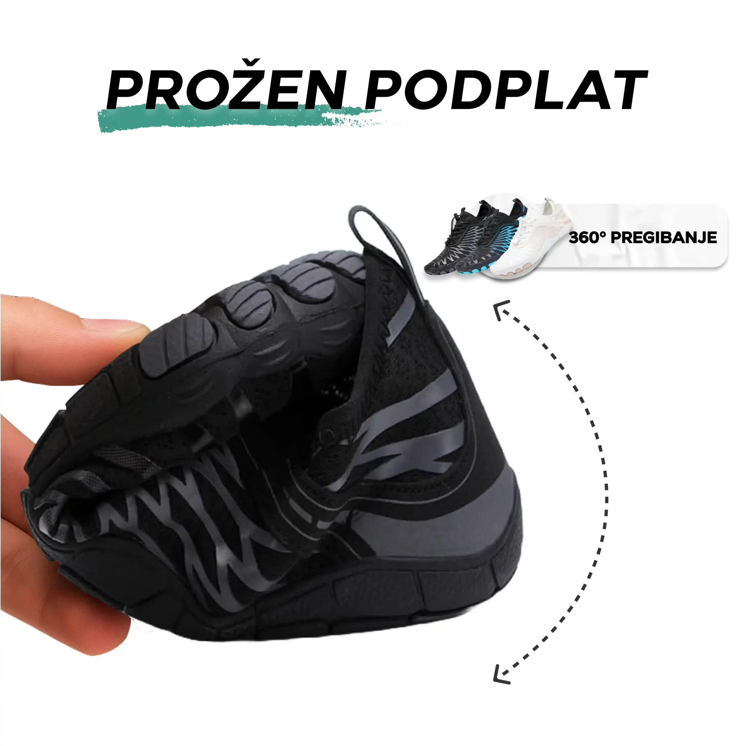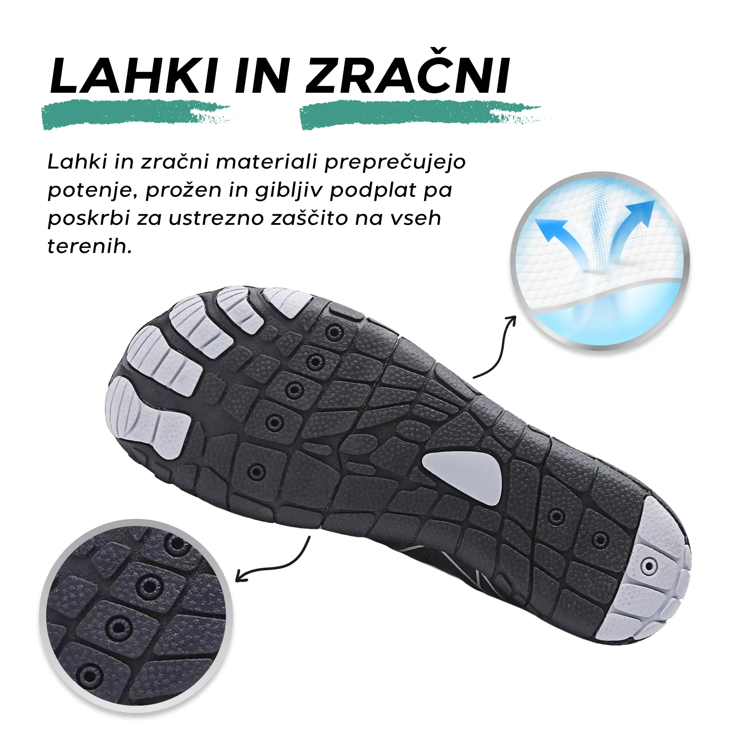 Anatomsko oblikovan sprednji del omogoča naravno razprtje prstov, medtem ko izjemno prožen podplat s tankim profilom izboljšuje občutek tal in stabilnost.
